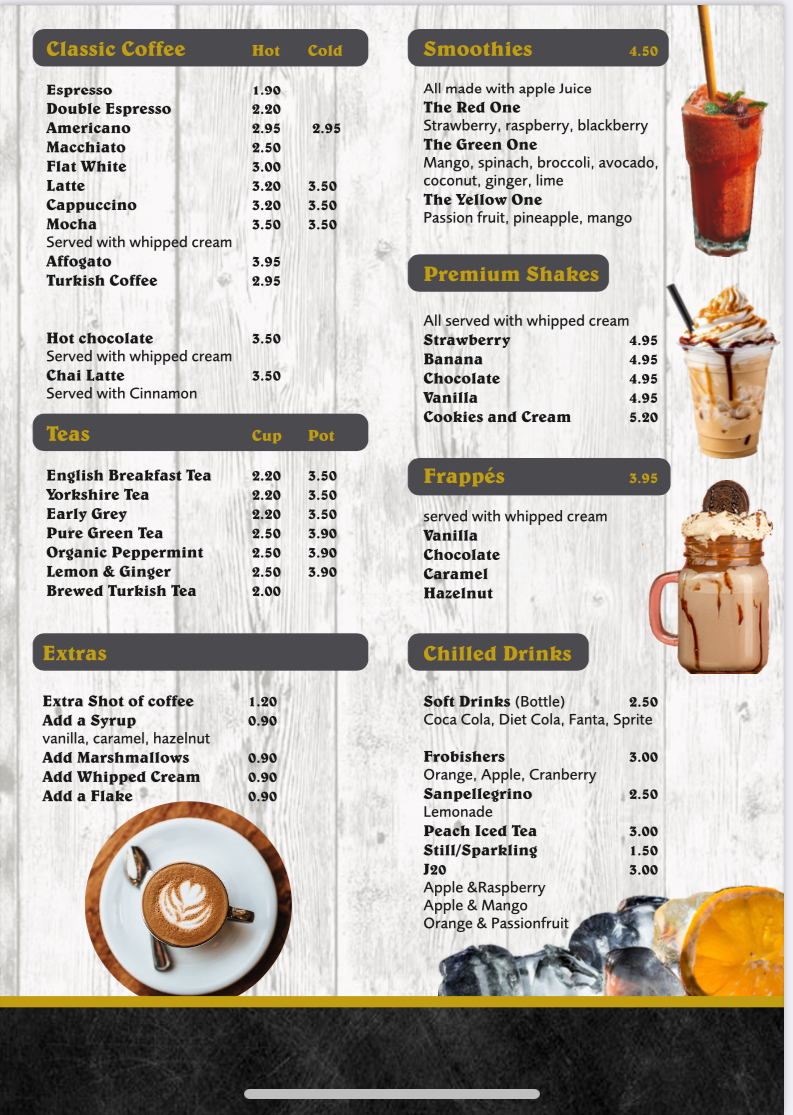 - Hot Drinks: The menu includes traditional Turkish Coffee, various coffee drinks, and specialty hot chocolates, catering to those seeking both caffeinated and chocolate-based beverages.