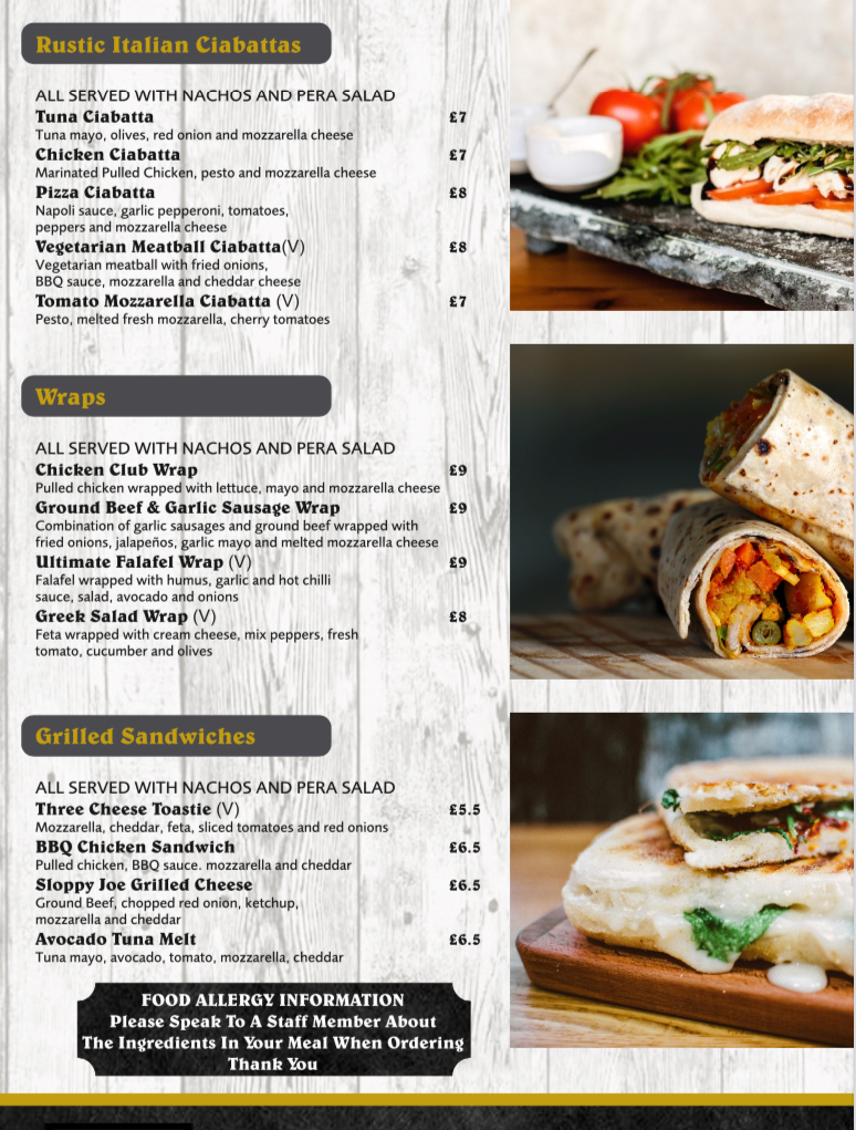 - Wraps: Including options such as a Chicken Club Wrap with pulled chicken, lettuce, mayo, and mozzarella cheese, as well as a vegetarian Ultimate Falafel Wrap with hummus, garlic and hot chilli sauce, salad, avocado, and onions.