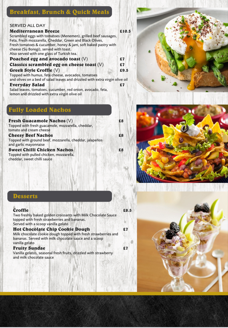 - Desserts: Options such as Croffle—a combination of croissant and waffle with milk chocolate sauce and fruit—and Hot Chocolate Chip Cookie Dough served with vanilla gelato. Brunch Pancakes are also available, served with fresh fruits and maple syrup.